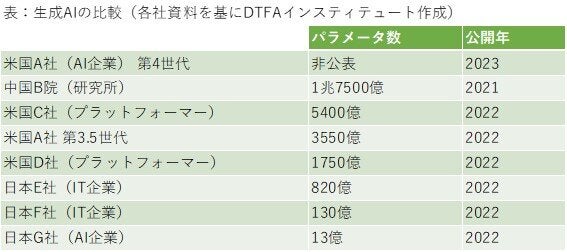 ただし、現状では、生成AIの複雑さを表し、性能を左右する「パラメータ数」(AIが学習時に最適化する必要のある変数の数)は、米国のAI企業やプラットフォーマーなどが開発するモデルが日本企業のモデルを凌駕している。(表)