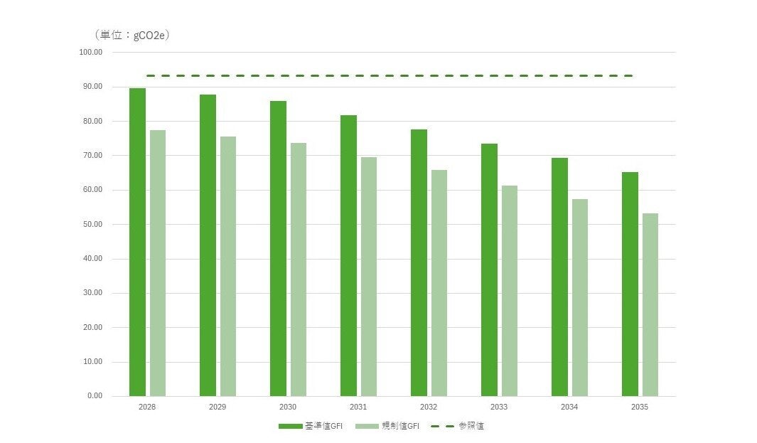 毎年の原単位排出削減目標は、二つの引き下げ率を参照値に反映させる形で算定される(注1)。例え2028年の場合、参照値を4%下回る89.57gCO2eq/MJが基準値GFIとなり、17%少ない77.44gCO2eq/MJが規制値GFIとなる。