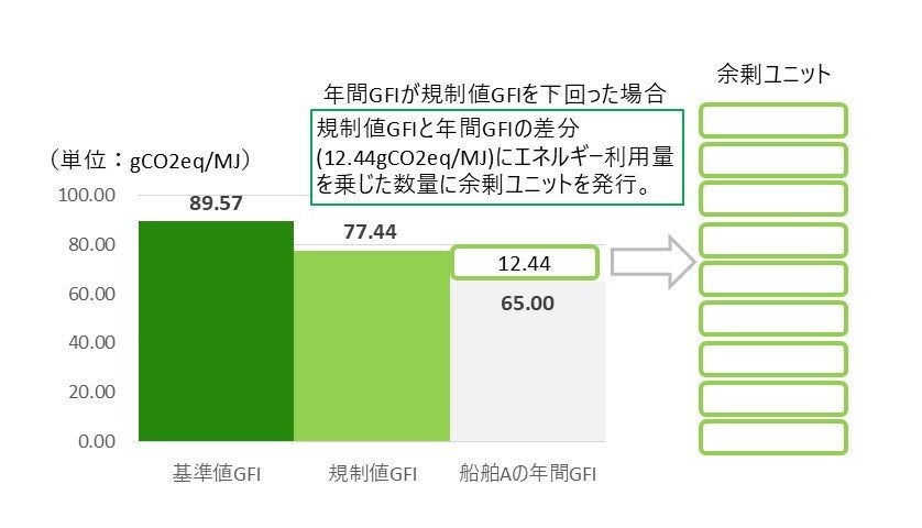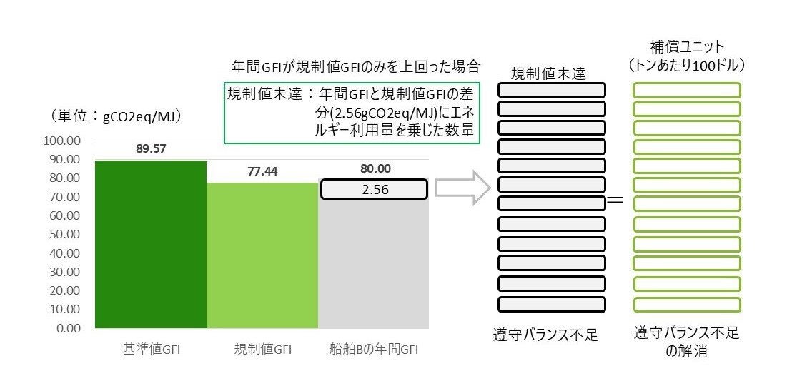まず、規制対象船舶の年間GFIを毎年、上記の手順で算定する。続いて、その年の規制値GFIから年間GFIを差し引き、エネルギー使用量を乗じる(注2)。この結果がプラスになれば遵守とみなされる。図表3の場合、規制値GFIと年間GFIの差が、12.44gCO2eq/MJであるため、これにエネルギー利用量を乗じるとプラスとなり、規制を遵守したとみなされる。一方で、マイナスとなった場合は遵守バランス不足とみなされ、遵守に必要な措置をとるよう求められる。