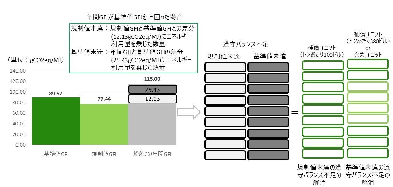 遵守バランス不足には二種類がありうる。一つは年間GFIが規制値GFIだけを上回った場合で、もう一つは基準値GFIをも上回った場合だ。ネットゼロ枠組みでは、この二つのパターンごとに異なる対応が求められている。