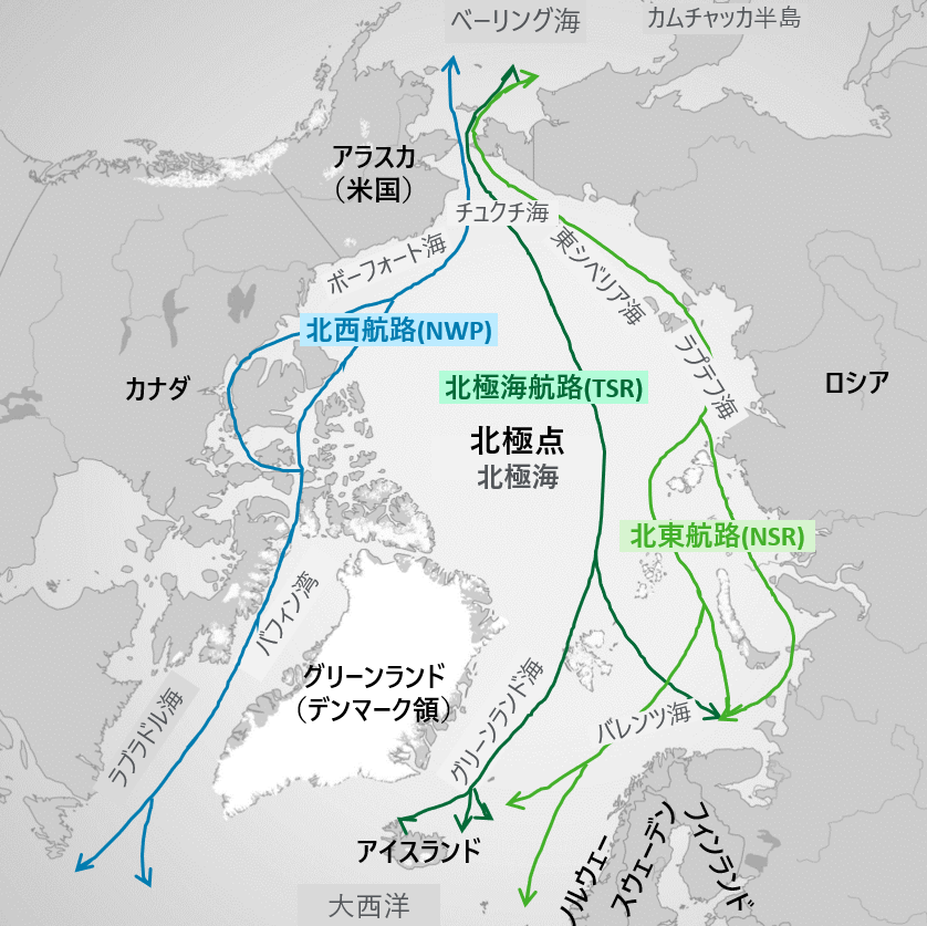 第一に、新たな航路開拓がある。気候変動による海氷面積の縮小に伴い、東アジアと米国、ヨーロッパと東アジアを結ぶ新たな海上ルートが注目を集めている。その主要な海路は、ロシア近辺の北東航路(Northern Sea Route: NSR)、北米側の北西航路(North-West Passage: NWP)、北極海を横断する北極海航路(Transpolar Sea Route: TSR)の3つである(※図2参照)。