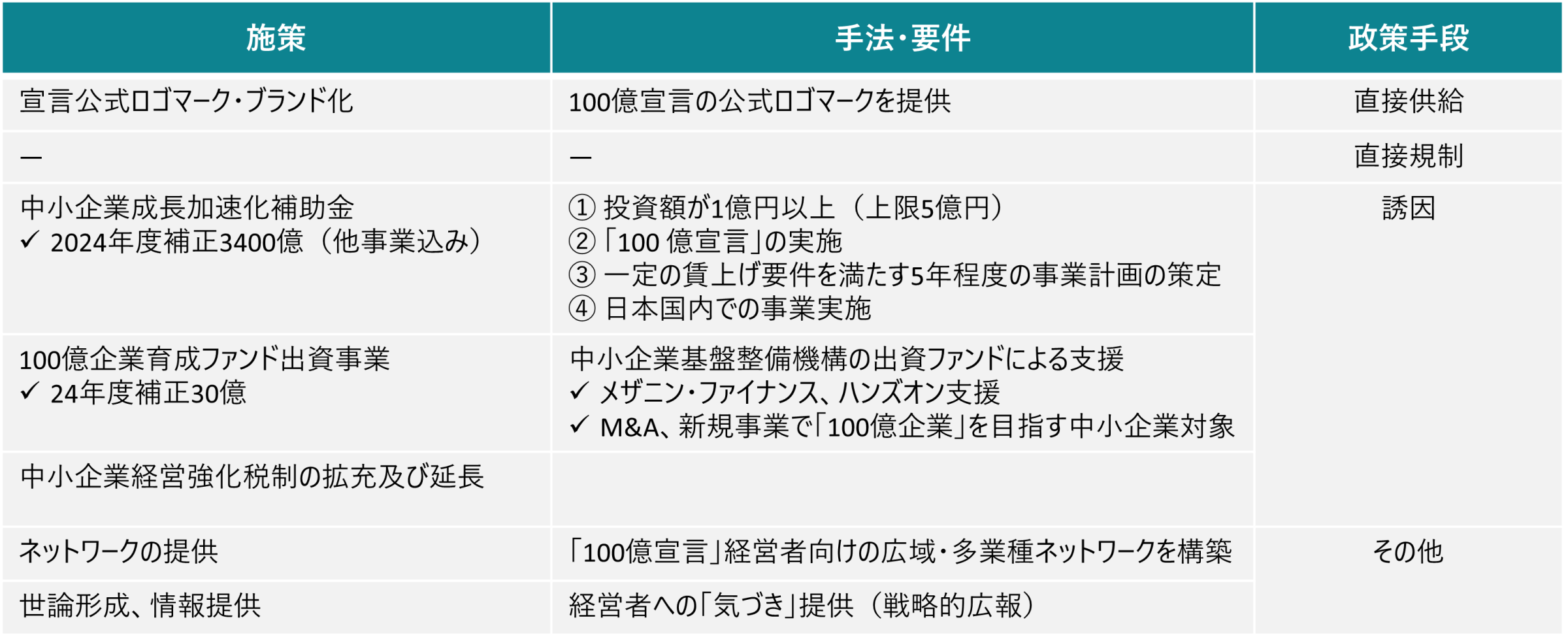 図表1 100億宣言政策の手法・要件、政策手段の類型