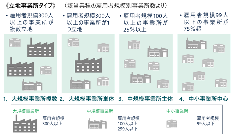 また、雇用者規模100人以上299人以下の「中規模事業所」であっても、人口規模の小さい市町村では大規模事業所並みの依存リスクがあるといえる。さらに、雇用者規模99人以下の「中小事業所」が同一業種で多数集積している場合は、大規模事業所が複数立地しているのと同様、その業界の状況変化(市場の飽和や陳腐化、競争激化など)から直接的な影響を受ける可能性がある。