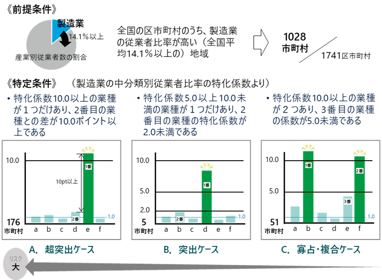2021年の経済センサス活動調査を用いて、各市町村で従業員数が「全国に比べて特化している業種」を特定した。さらに「A.超突出ケース」(176市町村)、「B.突出ケース」(5市町村)、「C.寡占・複合ケース」(51市町村)の3つに地域を分類した(図表1)。