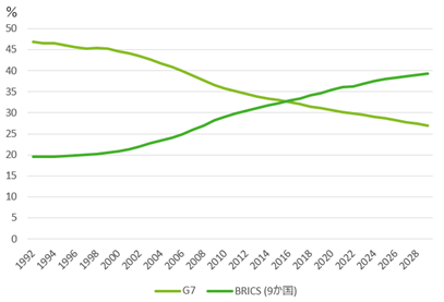 BRICSが世界の購買力平価(PPP)ベースのGDP(国内総生産)に占める割合は、近年急速に増加しており、2016年にはG7諸国(カナダ、フランス、ドイツ、イタリア、日本、英国、米国)を上回った。国際通貨基金(IMF)の予測によると、この差は今後さらに広がる見込みだ。2030年には、BRICSのシェアが世界経済の約40%に達する一方、G7は約25%程度にとどまると予測されている(図2参照)。
