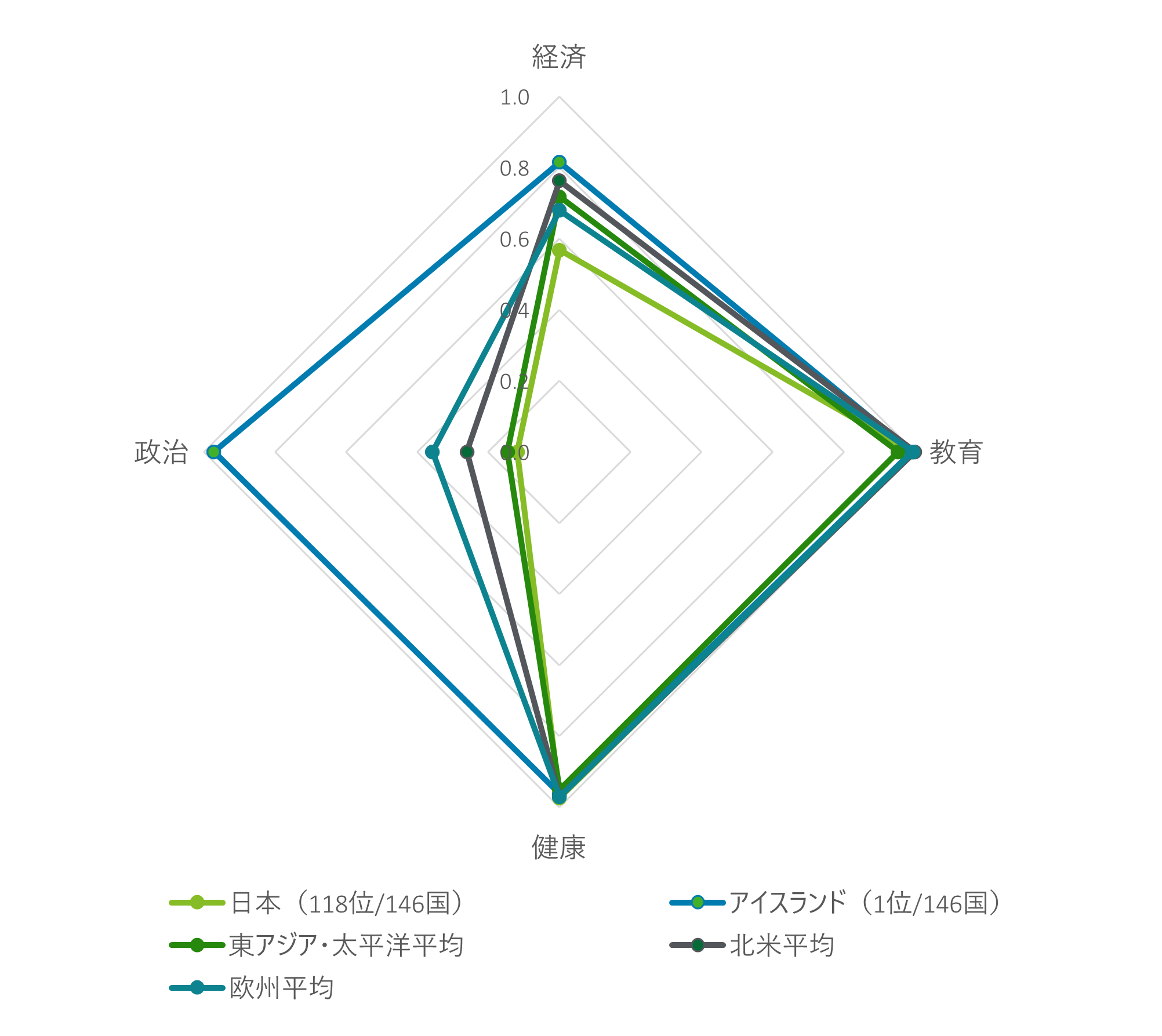 世界経済フォーラムは毎年ジェンダーギャップ指数を発表している。その2024年版で、日本は148ヵ国中118位と、G7の中で最下位であるだけでなく、アジアでも韓国の94位や中国の106位よりも下となっている。図1の通り、「教育」「健康」の値は高いが、「経済」「政治」の低さが顕著で、女性管理職比率、男女賃金格差、女性議員比率などが低水準であることが要因となっている。政治分野に女性が増えることで、経済分野での女性活躍推進に向けた政策が実現しやすくなる。両分野で女性が活躍できる環境が実現しない限り、国際的な立ち遅れを是正することは難しい。