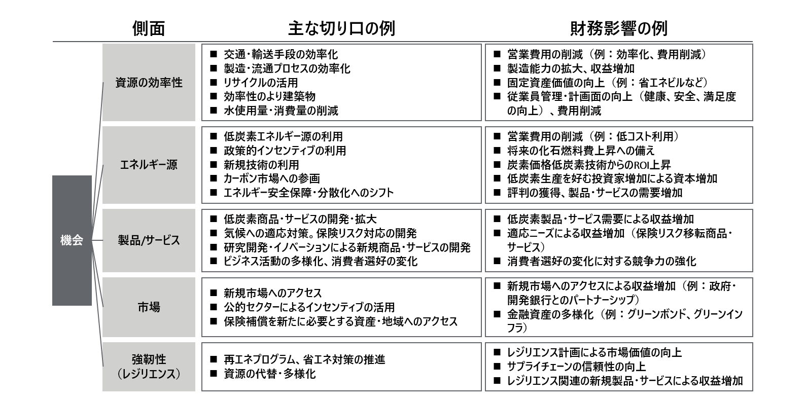 具体的に、外部環境分析としては市場分析や競合分析、顧客分析が主になり、内部環境分析では業績分析やバリューチェーン分析を行うことになります。さらに現在では、気候関連リスクおよび気候変動に取り組むことで生まれる機会にも留意すべきです。ビジネスモデル構築の手法自体は変わりませんが、脱炭素の流れによって新たに検討すべき要素が増えており、それに対応することが今後のビジネスにおいて大きなポイントとなるためです。その際、気候変動をリスクとして捉えるだけでなく、どうすれば自社にとってのチャンスにできるかを考えることも重要です。