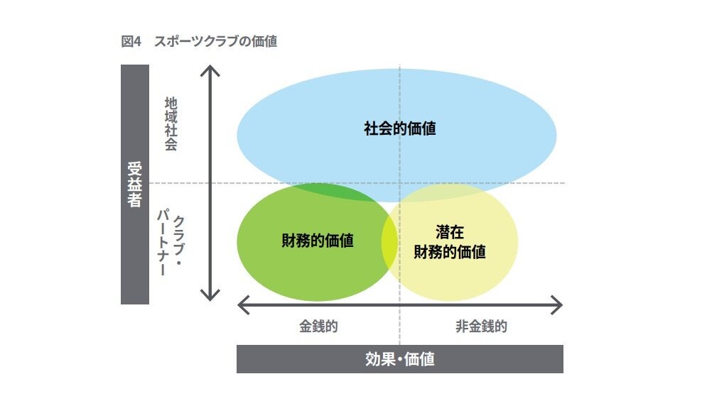 今回の上場解禁は、Jリーグが開幕当初から抱えてきた1つの大きな課題の改善に向かうインセンティブとなることも期待されます。それはクラブが生み出している社会的な価値の可視化という課題です。クラブの価値には、財務的な価値と社会的な価値の2つがあります。財務的な価値はスポーツクラブの興行などの活動によって生み出され、財務諸表に表れるクラブ自身の経済的価値となります。一方で、社会的な価値は、財務的な価値と同様、クラブの事業活動によって生み出されますが、クラブを取り巻く地域社会やその他のステークホルダーにもたらされる経済的価値および公益的価値の総和となり、財務諸表には表れにくいもので、非財務的価値ともいわれます。