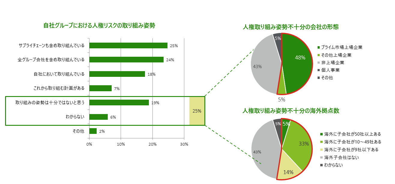 当社が2023年に行った「人権サーベイ2023」(上場企業を中心に約100社に対し人権意識や各企業の取り組み状況を調査)によると、「自分の所属する組織(企業など)で人権リスクに取り組む姿勢は十分か」といった質問に、「取り組みの姿勢は十分ではないと思う」「わからない」と回答した企業は、約25%にのぼった。この「取り組みの姿勢は十分ではないと思う」「わからない」と回答した企業を分析したものが、図1の右側の円グラフです。右上のグラフを見ると、約半数以上が上場企業であり、右下のグラフを見ると、海外に子会社があると回答した企業は半数を超えています。つまり、上場企業で、海外に進出している企業において特に、人権リスクへの取り組みに課題を感じている、といった傾向がみえます。