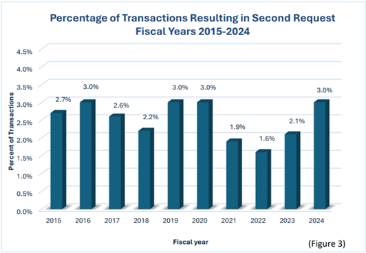 2024年度は1976年のハート・スコット・ロディノ反トラスト改正法(HSR法)に基づき、2,031件の届出があり、前年度の1,805件から226件増加している。(下記の図1参照)。これらの取引のおよそ4分の1は、10億ドルを超える規模であり、近年続いている、より大規模かつ複雑な取引への傾向が継続している。連邦取引委員会は30件、司法省反トラスト局は29件のSecond Requestを2024年度に発行、前年度から増加傾向にある(下記の図2参照)。