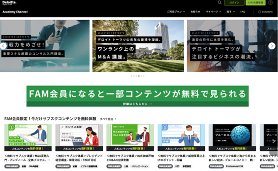 事業承継やM&A戦略などの知見を体系的に学習できるコンテンツプラットフォーム「Academy Channel」を運営、公開しており、M&Aのプロフェッショナルを育成するためのコンテンツを多数取り揃えています。