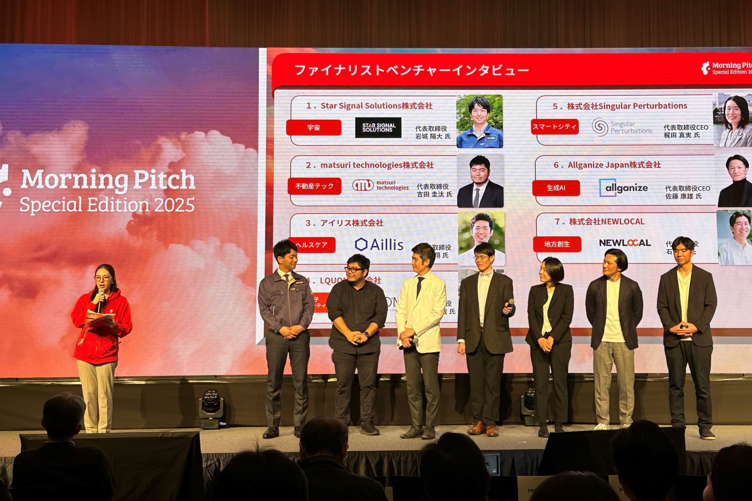 本イベント「Morning Pitch Special Edition 2025」は年に一度の特別版で、2024年の登壇企業213社の中から、審査員が選ぶ最優秀賞と来場者が選ぶオーディエンス賞の受賞企業を選出します。ファイナリストは7社、Star Signal Solutions株式会社(宇宙)、matsuri technologies株式会社(不動産テック)、アイリス株式会社(ヘルスケア/医療)、LQUOM(量子通信)、株式会社Singular Perturbation(スマートシティ/犯罪予測)、Allganize Japan株式会社(生成AI)、株式会社NEWLOCAL(地方創生)となりました。