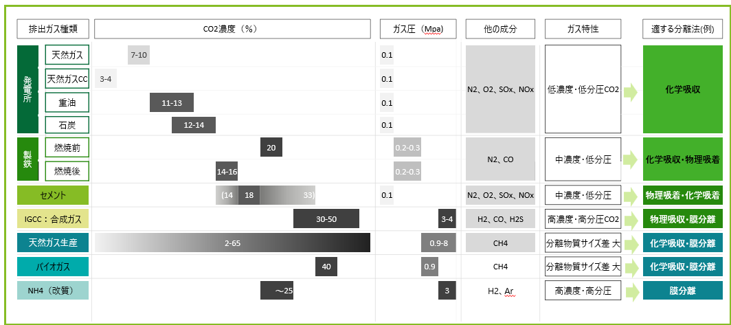 エネルギー/非エネルギー起源CO2は、排出される「CO2濃度」「ガス圧」「排気量」「ガス中成分」などの物性に応じた最適なCO2分離方式の選択が重要で、さらにコスト低減を進めて分離装置の導入を促進していく必要がある。