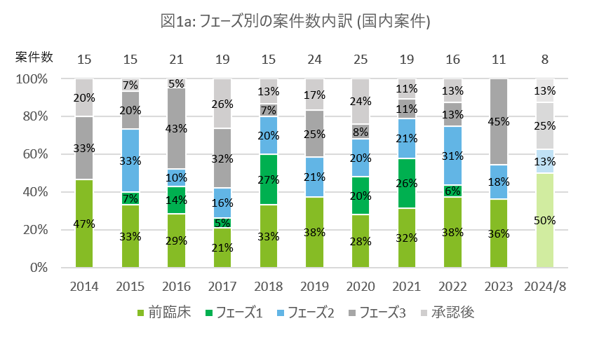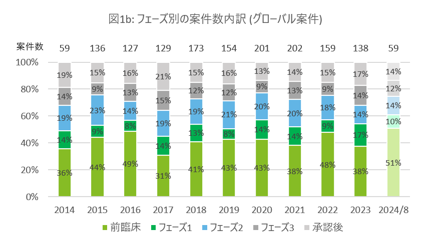 図1aおよび図1bでは、対象期間における国内案件と、グローバル案件を比較した際のフェーズ別の案件数の内訳を示しています。国内案件とグローバル案件との間には、年間案件数に大きな差異が見られます。