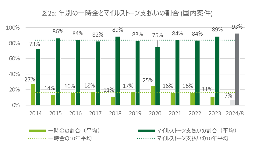 図2aおよび図2bでは、対象期間における一時金とマイルストーン支払い(上市前後のマイルストーン支払いの合計)の割合の内訳を示しています。