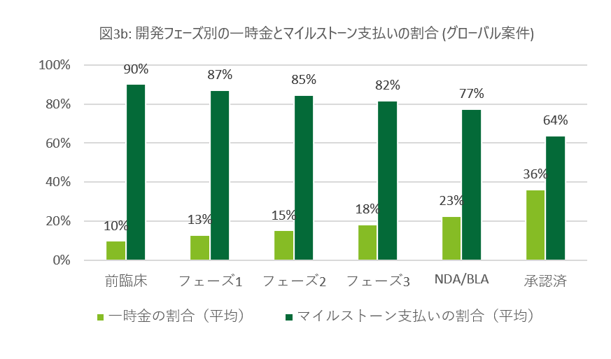 図3aおよび図3bでは、対象期間における開発フェーズ別の一時金とマイルストーン支払いの割合の内訳を示しています。開発が進むにつれて、一時金の割合が増加することは言うまでもありません。