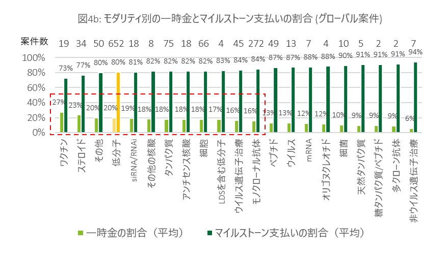 図4aおよび図4bでは、対象期間におけるモダリティ別の一時金とマイルストーン支払いの割合を示しています。フェーズ別のモダリティ分析を行うことで、モダリティごとに支払構造が異なる理由がより明確に理解できる一方、サンプルサイズが少ないなどの観点から包括的な分析が難しい点に留意が必要です。
