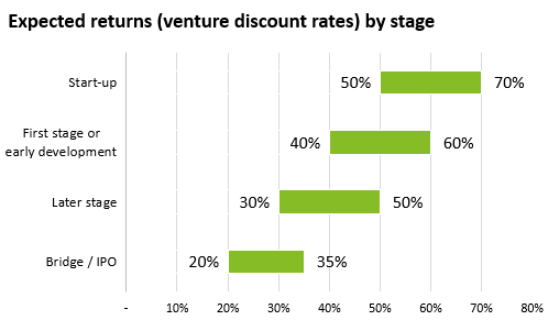 以下に、ベンチャーキャピタル投資が通常期待する収益率の一部を示します。収益をまだ生み出していない段階(収益前段階)の投資では、失敗リスクが高いことを補うために、必要な収益率が相対的に高くなる傾向があります。