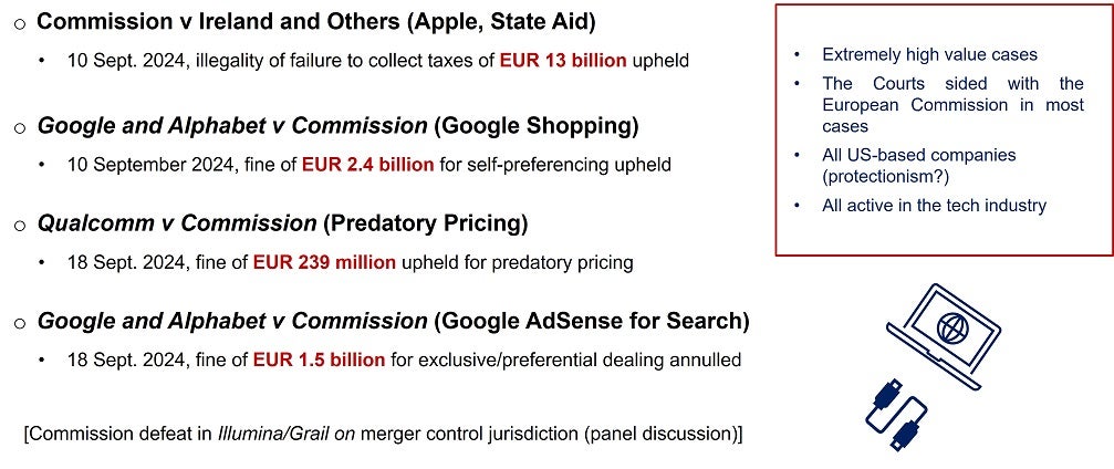 2024年9月、EU裁判所でいくつかの重要な判決が相次ぎました。Appleは130億ユーロの税金未払いに対する罰金を科せられ、Googleも2つの異なるケースでそれぞれ24億ユーロと15億ユーロの罰金を受けました。さらに、クアルコムに対しては2億3900万ユーロの罰金が科されるなど、特にアメリカの大手テック企業に対する制裁金が目立っており、EUの競争政策に保護主義的な傾向が見られています。