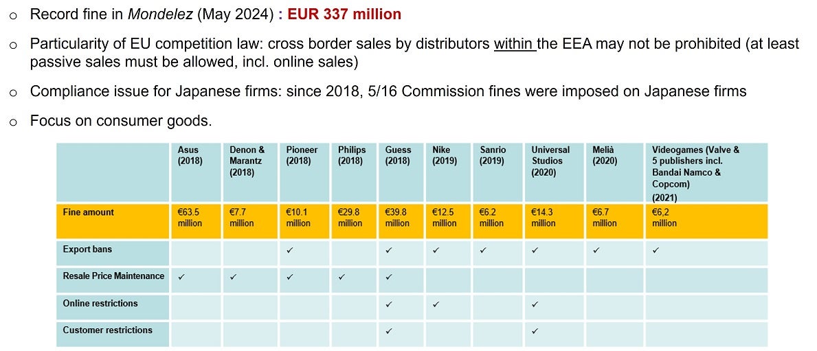 EU競争法の特徴的な側面として、垂直的制限の問題があります。欧州経済領域(EEA)内での国境を越えた販売を制限することが厳しく禁止されており、2018年以降、日本企業に対する制裁金の決定が5件ありました。特に消費財分野に焦点が当てられており、日本企業の皆様には注意が必要だと考えています。
