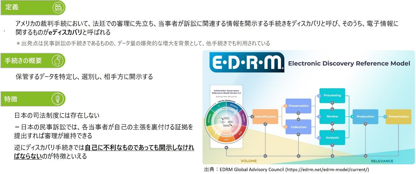 ディスカバリとは、アメリカの裁判手続きにおいて、審理前に当事者が訴訟関連情報を開示する手続きです。電子情報に関わる場合は特にeDiscovery(電子情報開示手続)と呼ばれます。具体的には、関連データの特定、保全、収集、処理、レビュー、分析、提出という一連のプロセスを行います。自己に不利なものも開示しなければならないことが特徴です。