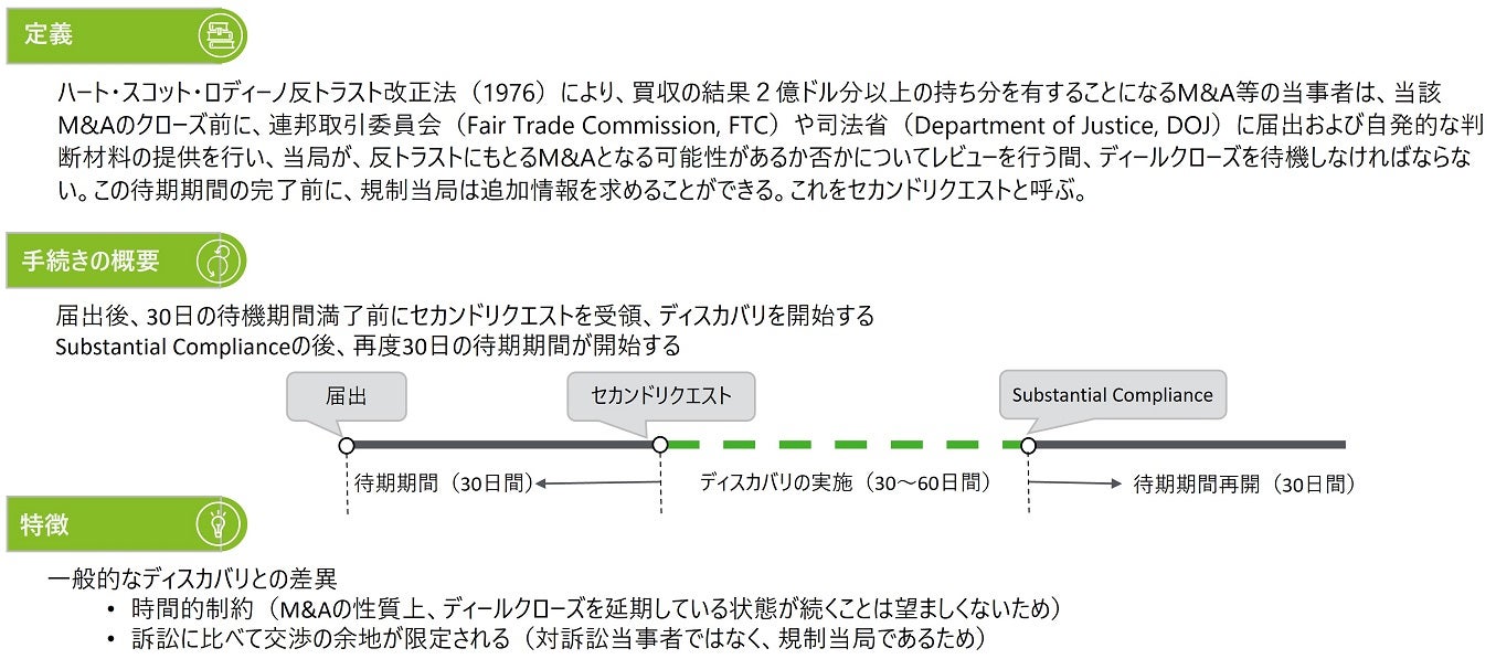 セカンドリクエストは、M&Aなどの当事者が、FTCやDOJに届出を行い、当局が反トラストに基づくM&Aとなる可能性を審査する際に追加情報を求める手続きです。バイデン政権下で、これらのリクエストが増加しており、手続きがさらに厳格化されました。一般的なディスカバリと異なり、時間的制約が厳しく、交渉の余地が限定されます。