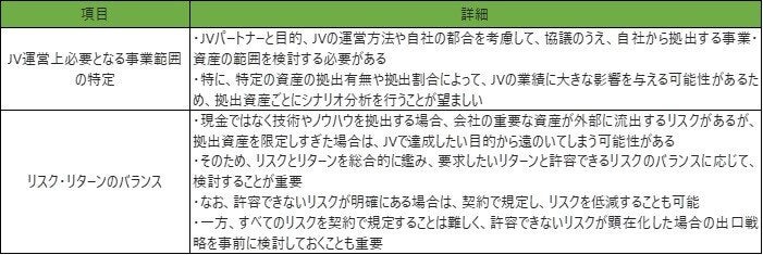 JVを設立する際、出資比率の検討にフォーカスしがちですが、拠出資産の検討が不十分な場合は、後々のJVの運営上問題を引き起こす可能性もあり、出資比率のみならず、どのような資産をどの程度拠出するかを検討することは非常に重要です。