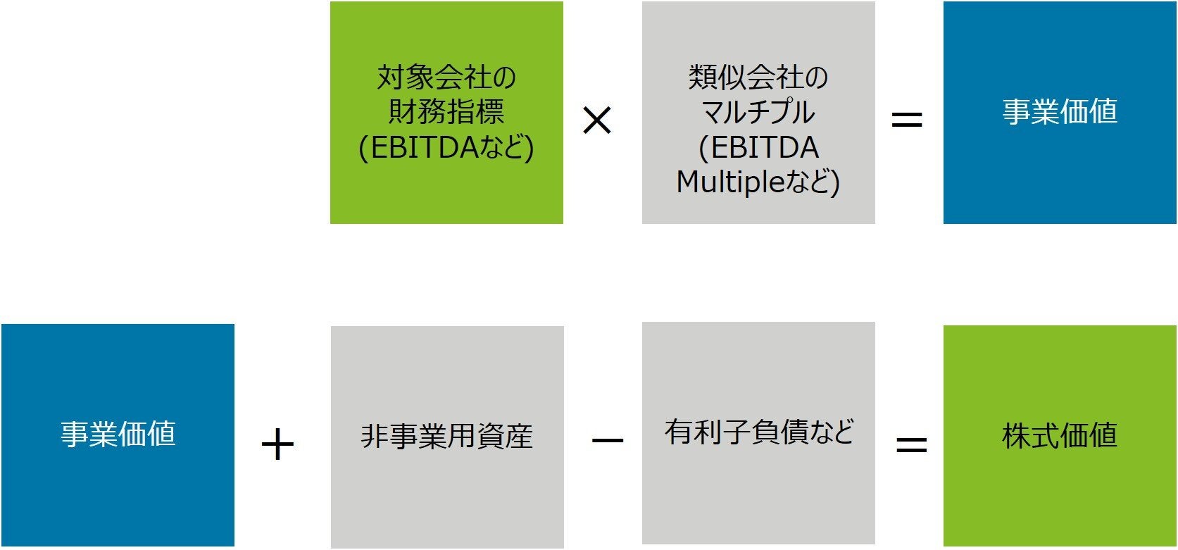JVとビジネスモデル・財務構造などが類似した上場類似会社の市場株価をベースとし、売上高、営業利益、EBITDA(償却前営業利益)、当期利益、純資産額などの財務数値から株式価値を導出する手法