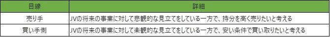 このような状況に陥った場合、一方のパートナーが他のパートナーの持分を買い取ることが多いですが、「売り手側」と「買い手側」双方において、JVに対する目線感が異なり、取引における目的も異なるため、利益相反が必然的に存在する構造といえます。