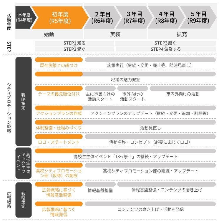 人口減少、少子高齢化などが急速に進展する現代の日本において、現行維持では市⺠⽣活の活力低下、地域経済のマイナス影響が避けられません。そこでシティプロモーション戦略として、様々な分野で「選ばれる市」となることを目指した取り組みを進めることで、Uターン人口などの増加を目指したいと思います。