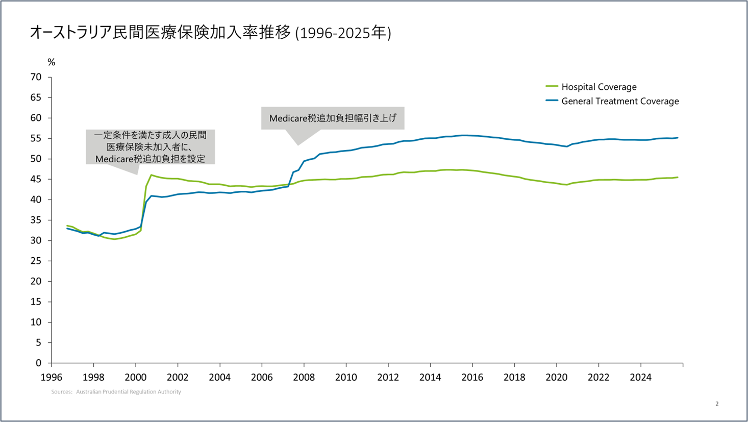 実際、民間医療保険の加入率は、2000年時点の約30%から2024年にはHospital Cover(病院での治療費をカバーする商品)が約45%、General Treatment Cover(病院以外での治療をカバーする商品。Medicareでは歯科・眼科(眼鏡・コンタクト等)等がカバーされていないため、特に歯科にかかる保険のニーズが強い)が55%へと、それぞれ大幅に増加している。加えて、政府もMedicareを補完する役割として民間医療保険に期待しており、一定の条件を満たす民間医療保険未加入者にMedicare税の追加負担を課すなど、事実上の民間医療保険加入促進をおこなっている(図2)。