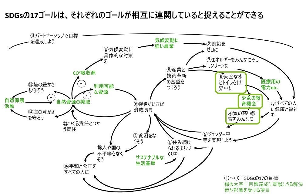 SDGsは国際社会全体で取り組むべき開発目標として2015年に国連総会で採択されたもので、貧困や飢餓、気候変動、格差是正など17種類のカテゴリに分かれています。これらは一見バラバラの課題に見えますが、ひとつの課題のゴールを考えていくと、ほかの課題も解決する必要があったり原因が共通していたりするなど、相互に連関していることが見えてきます。