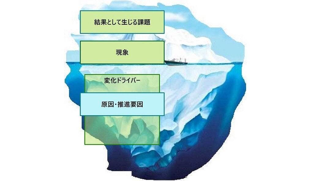 1日目のワークショップでは、参加者が選んだテーマを「アローアイスバーグ分析」という手法を使って考え、本質的な課題が何なのかを見付けるところまでを体験します。アローアイスバーグ分析とは、課題を氷山に見立て「見えている課題」の下部に原因を配置することで、全体としてどんな構造が隠れているかを見付け出すオリジナルの分析手法です。