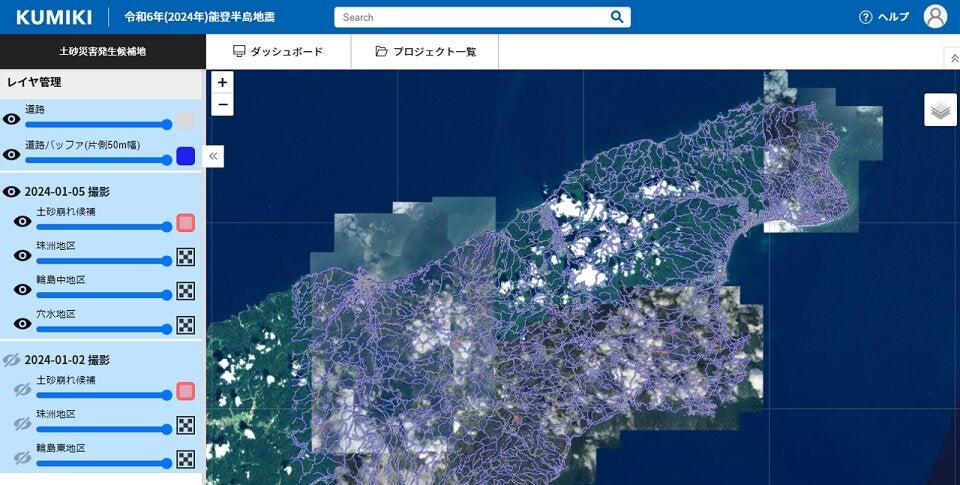 2024年1月1日の能登半島地震発生直後には、国土地理院が提供する石川県珠洲地区・輪島中地区・穴水地区の衛星写真・航空写真から土砂崩れ災害に関する解析を行い、1月6日にはデータを無償で公開しました。私(渡邉氏)が実家の岐阜に帰省しており大きな揺れを感じたことや、昨年末に金沢で会社の忘年会を開いたことがきっかけで、純粋に社会貢献のためです。社員も休日返上で積極的に取り組みました。