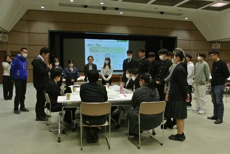 今回のワークショップは、高校生、地元企業、市職員の方々の参加のもと、DTFAの運営により開催されました。前半は、本ワークショップを主催する四国中央市の担当者より冒頭挨拶やワークショップの目的についての説明、そして市の概要紹介がありました。後半は、高校生、地元企業、市職員の方々が3つのテーブルに分かれ、グループごとにまちの魅力や課題、将来像について意見を出し合いました。