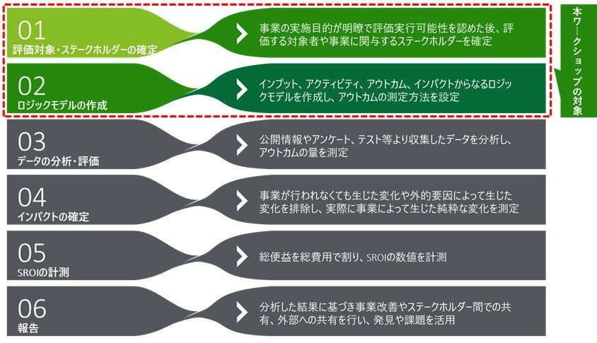本年度のワークショップでは、SROI(社会投資収益率)を用いたフレームワークが採用されています。SROIとは、政府、非営利団体等によるプログラムの価値を評価するために生まれたフレームワークです。このフレームワークでは、図1に示す6つのステップを通じて、定性的・定量的に取り組み等による社会的インパクトを分析します。今回もこの6つのステップに沿ってまちを分析評価していく計画で、今回のワークショップではステップ1と2が行われました。なお、SROI分析の詳細についてはこちらをご参照ください。