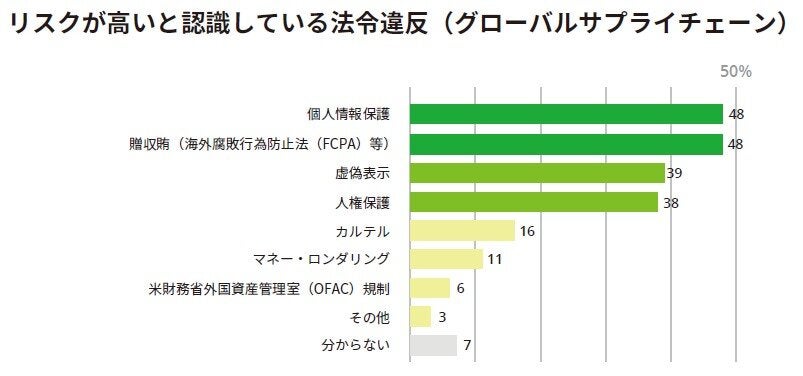 「虚偽表示」「人権保護」にも約4割と高い関心が払われています。虚偽表示は国内のみならず、海外で日本企業が摘発される事例が増えています。人権保護も国際的関心が高く、強制労働や児童労働などを、自社グループだけでなく取引先を含めて禁止し、人事デューデリジェンスを義務付ける法律やガイドラインが各国で整備されつつあります。法令違反リスクを、グローバルサプラチェーン全体にわたって管理する必要性が広く認識されてきていることを示しています。