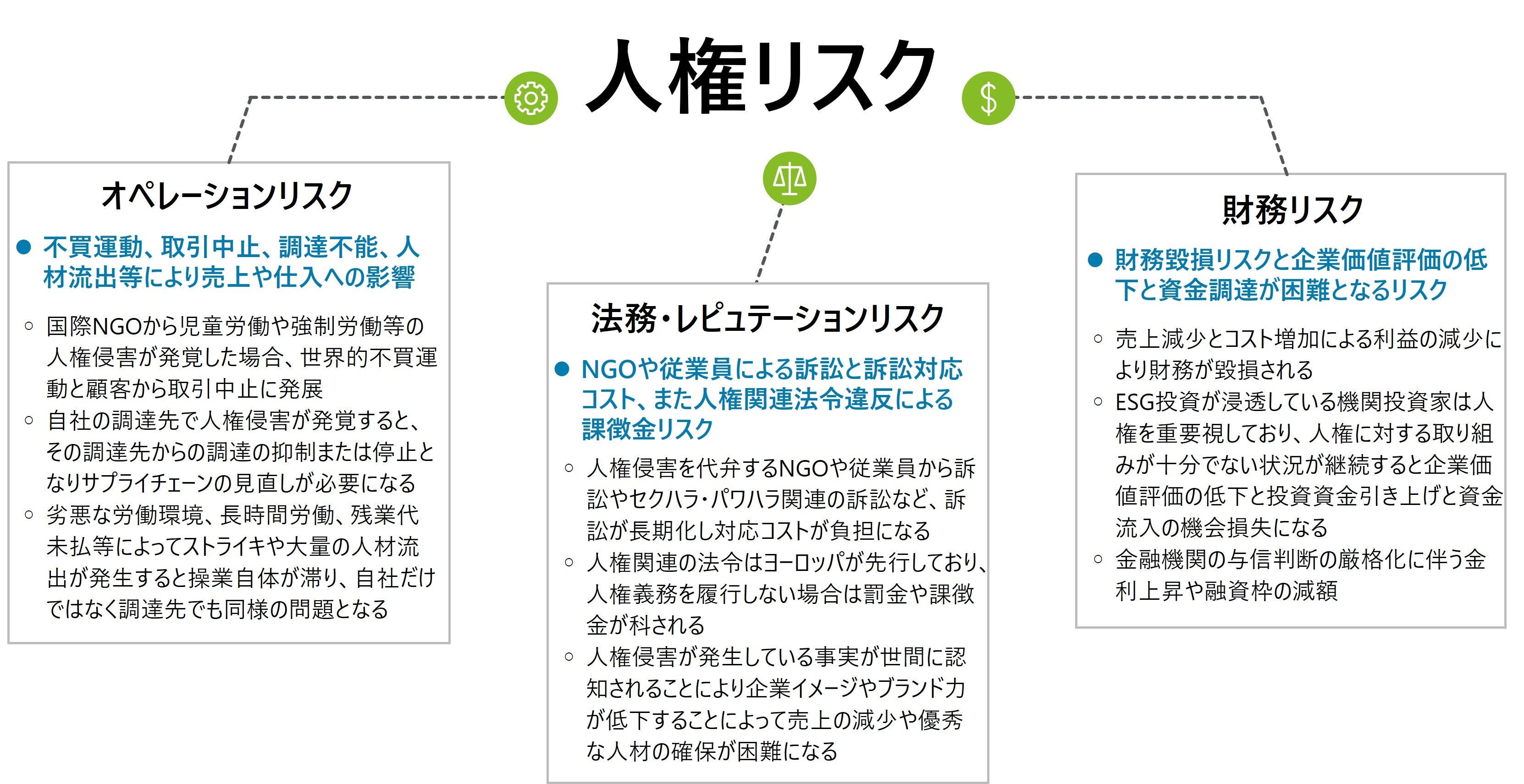 2つ目は法務・レピュテーションリスクです。人権侵害関連の訴訟が長期化し対応コストが負担になります。人権関連の法令はヨーロッパが先行しており、人権義務を履行しない場合は罰金や課徴金が科されます。また、人権侵害が発生している事実が世間に認知されることにより企業イメージやブランド力が低下し、顧客の離反が生じたり優秀な人材の確保が困難になったりします。