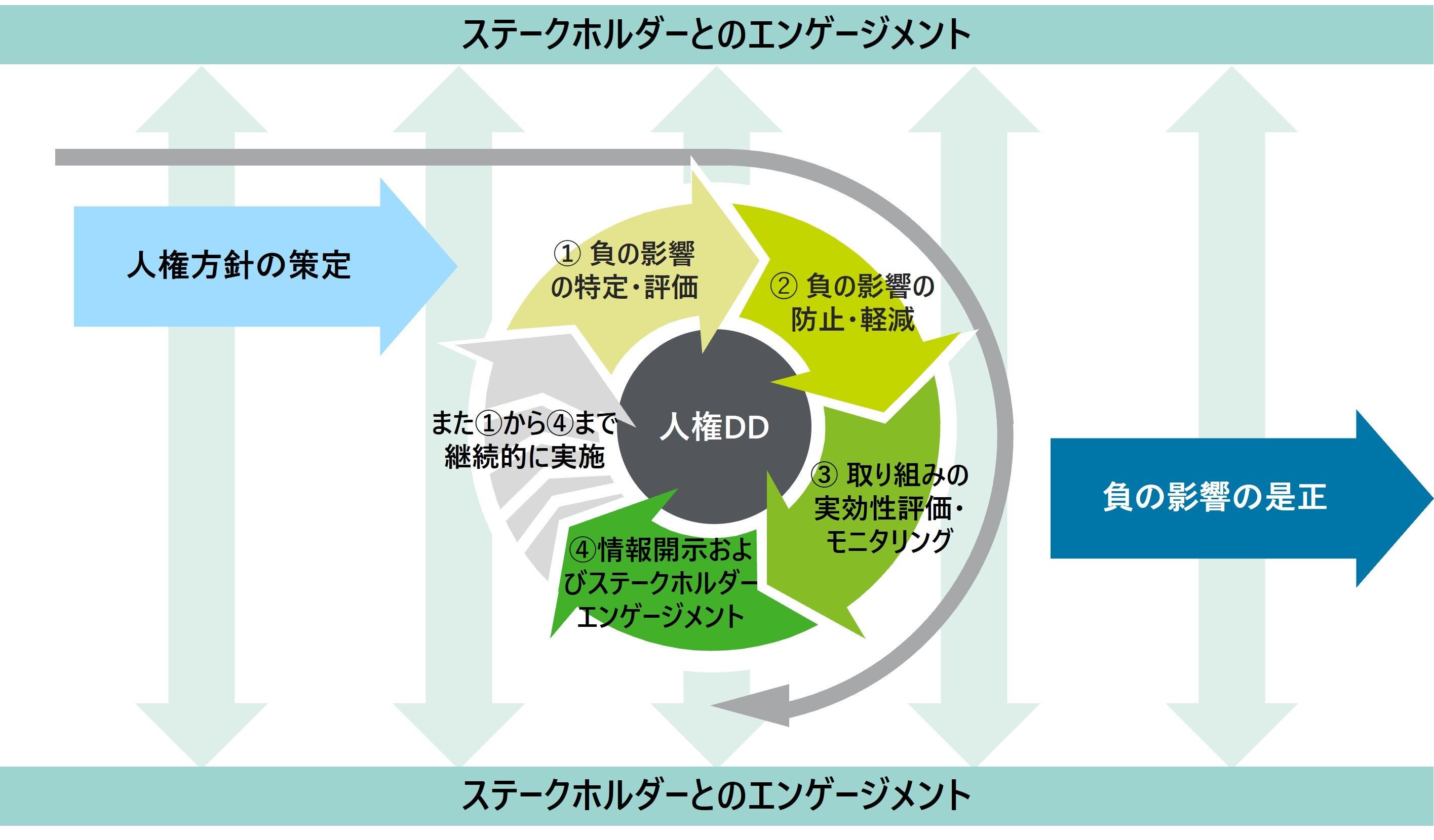 企業とステークホルダーとの対話を継続的に行い、そこで得られたフィードバックを上記のステップに組み込まなければなりません。よりよい人権尊重の取り組みを実施するために、ステークホルダーエンゲージメントは、人権尊重の取り組みにおける全てのプロセスに実施する必要があります。