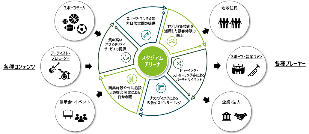 スタジアム・アリーナの用途は、ホームスポーツチームの本拠地としての利用がベースではあります。ただし、それだけでは十分な収益を上げることができません。そのため、スポーツのみならず展示会やライブイベントなど様々なコンテンツを提供する、マルチユースなアセットにすることが大切です。そうすることで、収益性および稼働率の向上のほか、多様なプレイヤーをつなぐ“ハブ”としての役割を果たし、エリアの価値向上に資する起爆剤にもなり得ます。