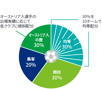 まずオーストリアリーグでは、安全なリーグ経営の助けとなる均等配分が30%、競技結果などによるインセンティブによってもらえる競技配分が70%を占めます。そしてこのリーグの配分金制度の特徴は、「オーストリア人の壺」といわれる仕組みにあります。具体的には、地上波放映権の50%を配分する基準として、オーストリア人選手の一定の起用と18歳以下の選手の起用を採用している点です。この仕組みがあるために、外国人枠を設けていない同リーグにおいては、必然的にオーストリア人選手の出場が確保されるインセンティブが働くことになっています。それにより、実践的な育成が可能になり、5大リーグへのステップアップ移籍が1つの流れとなり、サッカー協会が掲げている自国のレベルアップを実現することにつながっています。この制度が採用された背景は、EU域内での移籍の自由化と外国人枠の撤廃が決まった1995年のボスマン判定が契機といわれています。東欧に接しており、競技レベルと待遇が良かったオーストリアリーグに東欧の選手が増加して、自国選手の出場が減少してしまったため、その対応策として採用された制度です。直近では「オーストリア人の壺」による公式戦の出場という実践的な育成の成果として自国選手の実力も上がり、出場機会がより確保できるようになったため、「オーストリア人の壺」の比率を30%まで緩和し、集客などの項目のインセンティブ比較率を上げる施策に切り替えていく動きとなっています。