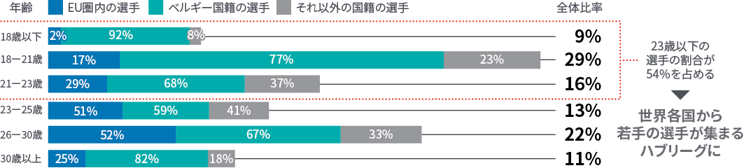 ベルギーリーグの移籍金制度の特徴は、選手獲得時の税制優遇にあるといえます。その結果としてベルギーリーグには、国外からの有望な若手選手の獲得が活性化し、立地を生かしたヨーロッパの若手有望株のハブリーグとなっています。具体的には、国外から獲得した選手の所得税の一部が所属クラブに還元される制度で、海外から若くて将来性のある選手をクラブは実質的に安く獲得することができる仕組みとなっています。また若手が集まる特徴を踏まえ、独自の育成メソッドによる自国選手の育成にも注力することで、自国チームの強化にもつなげています。このように国内外から若くて有望な選手を獲得して試合経験を積ませることで育成し、5大リーグなどの主要リーグに移籍させる流れができています。さらにベルギーはヨーロッパの中央に位置し、各国のスカウトが視察に来やすい利点もあり、ドイツ語、フランス語、オランダ語と複数の公用語が存在しているため、移籍交渉などのコンタクトを取りやすいという地政学的利点もあります。その結果ベルギーリーグの全体の売り上げの約11%を移籍金による収益が占め、規模の小さい自国マーケットにおけるスポンサー収入、チケット収入を補完する重要な収入源となっています。なお、オーストリア同様、世界的に有望な若手選手ではない限り移籍金は高額ではなく、選手がステップアップした際のTCによる中長期的な移籍金ビジネスとなっていることも特徴です。