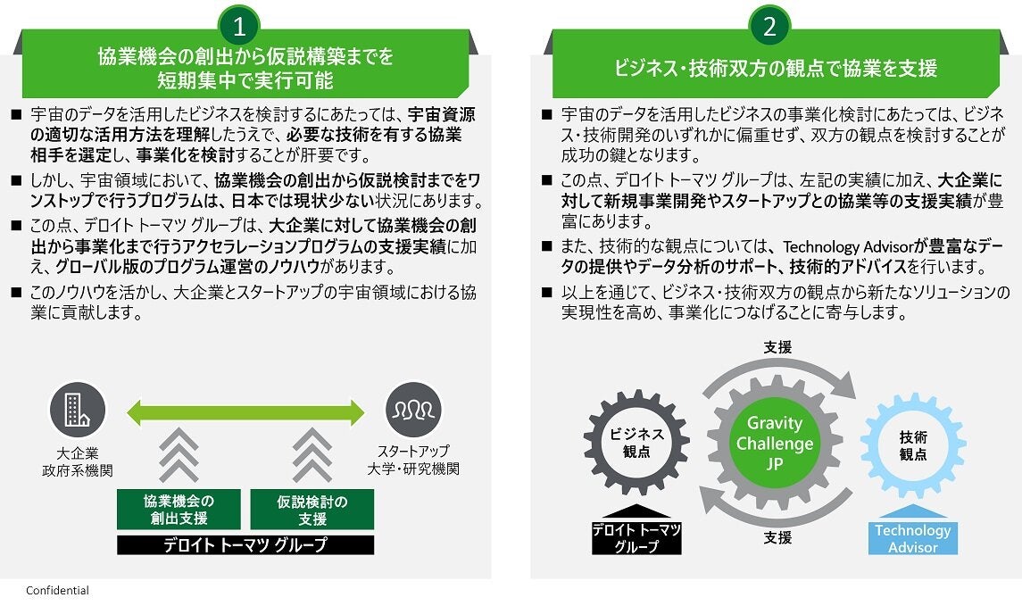 このGRAVITY Challengeでは、政府系機関や大企業などがChallengerとなり、環境や海洋、災害、農業や漁業など、実際に政府や企業が抱える課題を公開します。その具体的な課題に対して、AIやクラウド、ロボット、あるいは衛星を用いた地球観測などの技術を持つベンチャー企業などがInnovatorとして解決策となるアイデアを提示します。そのうえでデロイトも積極的に関わりながらマッチングを図り、詳細検討によって新たな価値を創出できると判断できれば事業化に向けて進めていくというものになります。