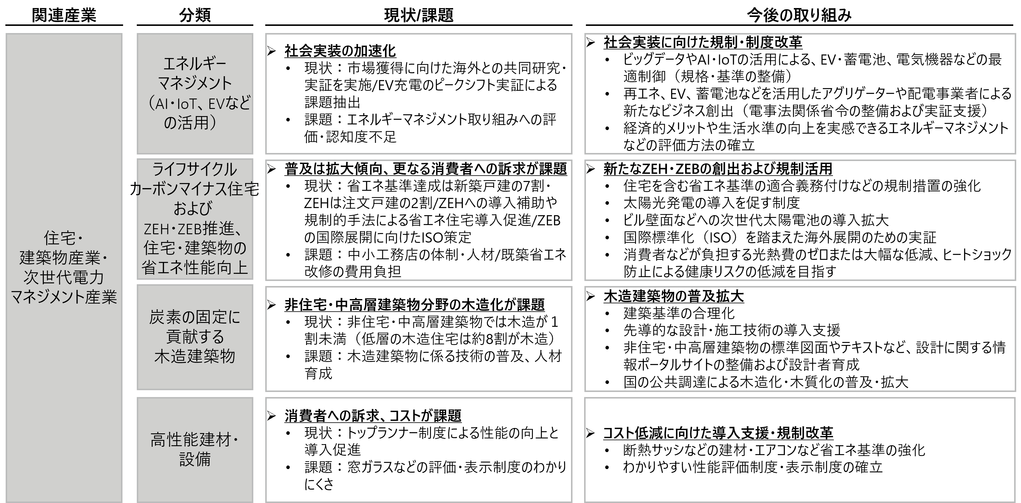 同産業においては今後、現状の課題を踏まえ、AI・IoTの社会実装や新たなZEH・ZEBの創出、木造建築物の普及拡大などが進んでいくことが見込まれています。
