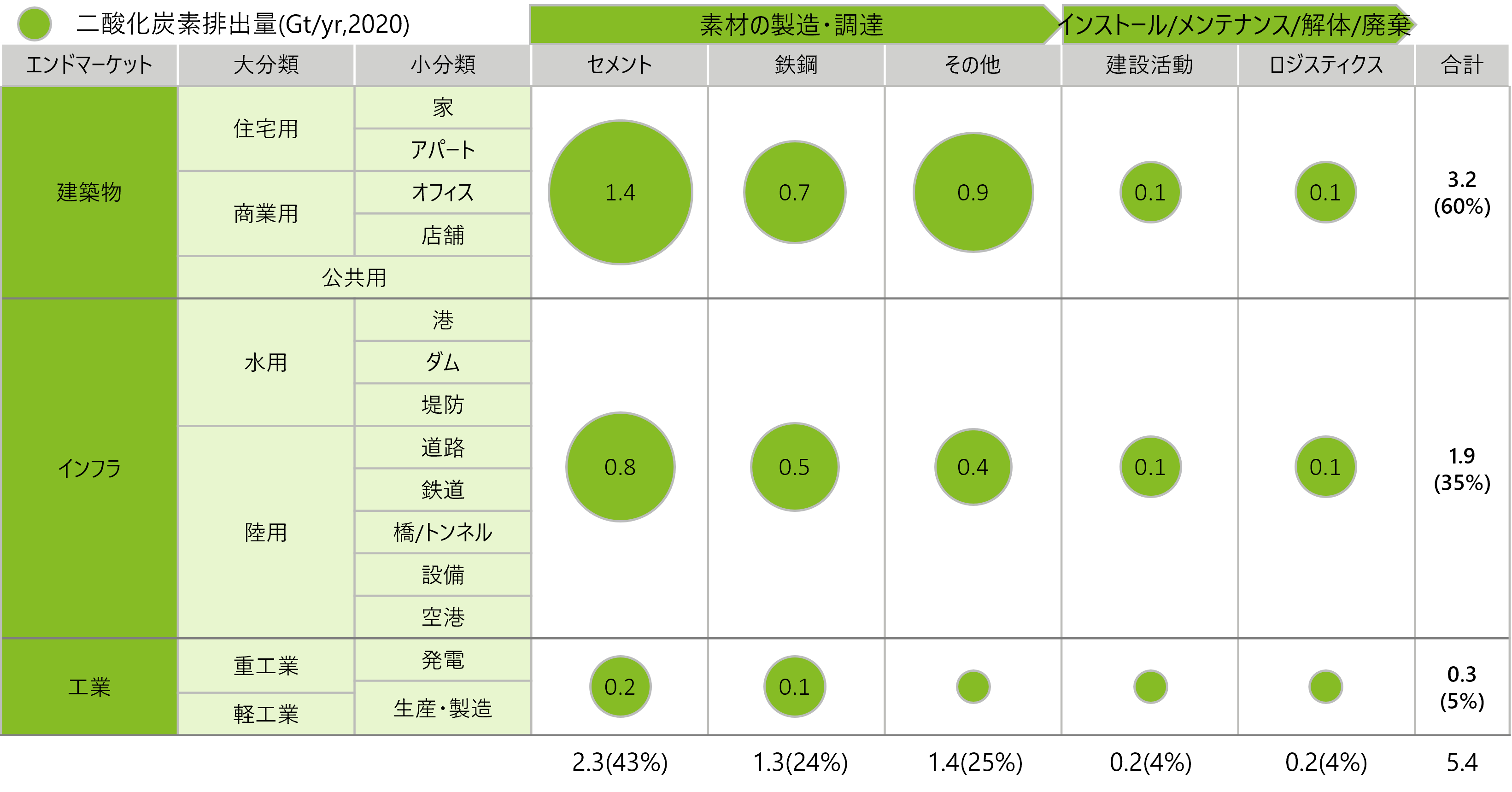 なお、建設不動産業界におけるCO2排出割合について、エンドマーケット別に見ると「建築物」の割合が、プロセスごとに区切ると「素材の製造・調達」過程の割合が最も高い結果となっています。