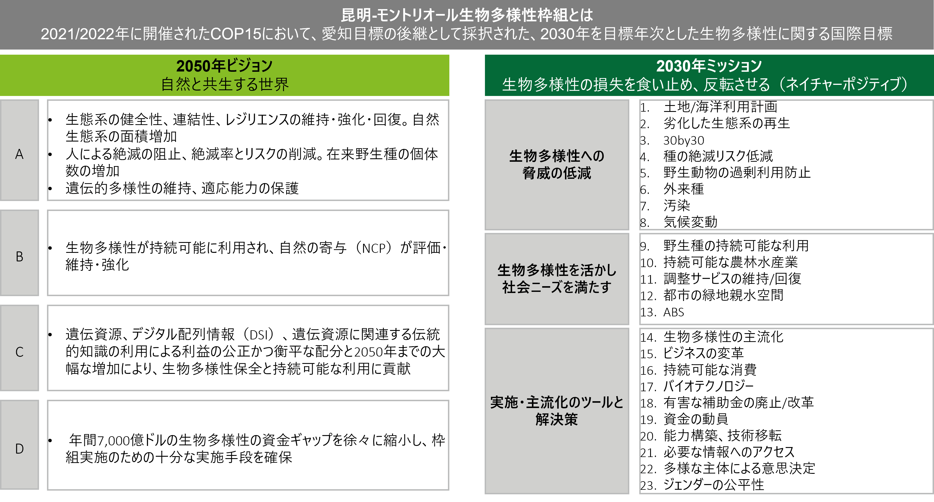 生物多様性に関する世界的な枠組みに、2022年12月に採択された「昆明・モントリオール生物多様性枠組」があります。同枠組では、2030年までに「生物多様性の損失を食い止め、反転させる(ネイチャーポジティブ)」をミッションに掲げ、自然と共生する世界を目指します。