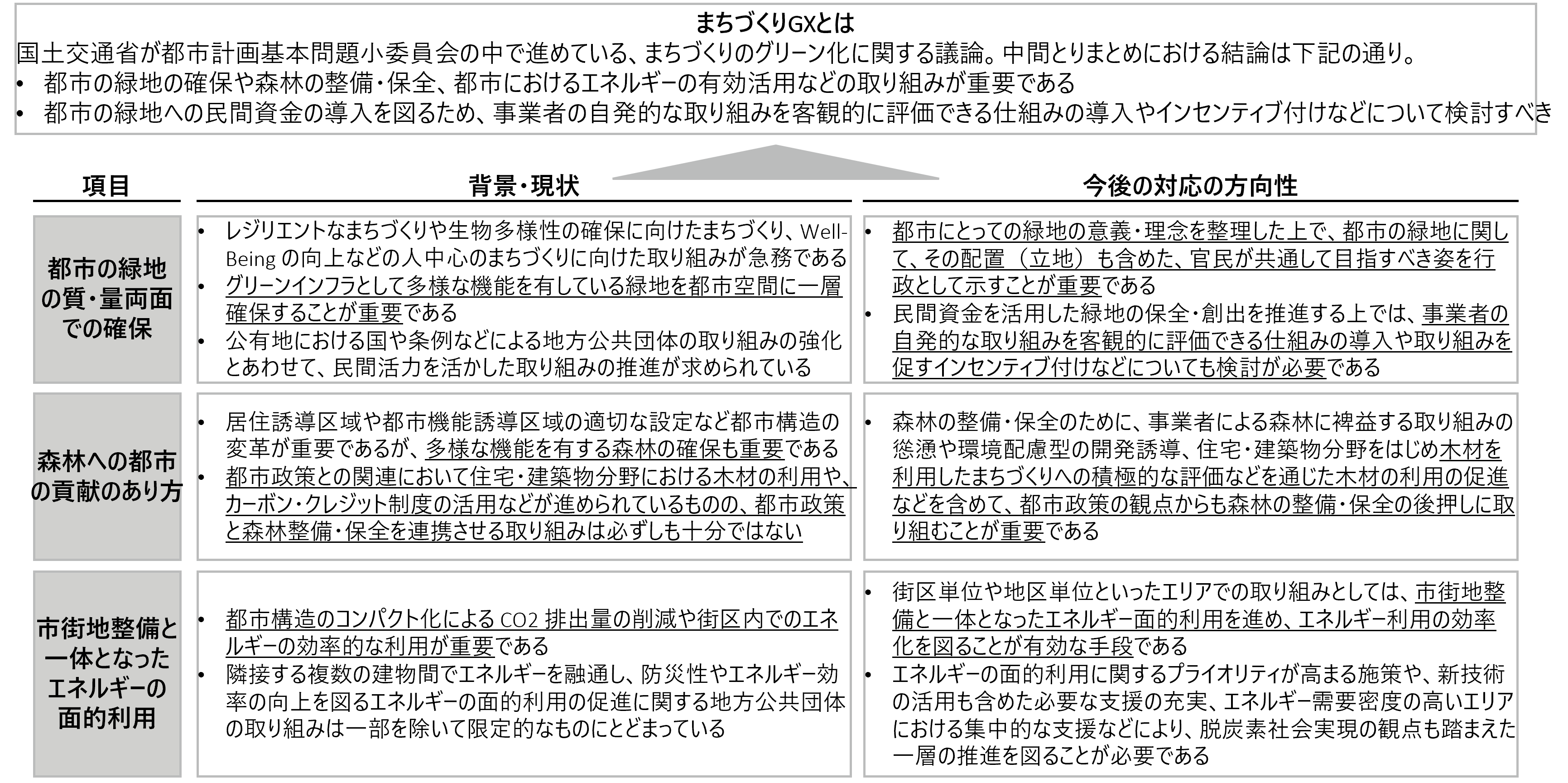国土交通省では、都市計画基本問題小委員会において、まちづくりのグリーン化に関する議論を進めています。中間とりまとめにおいて、以下の結論が示されました。