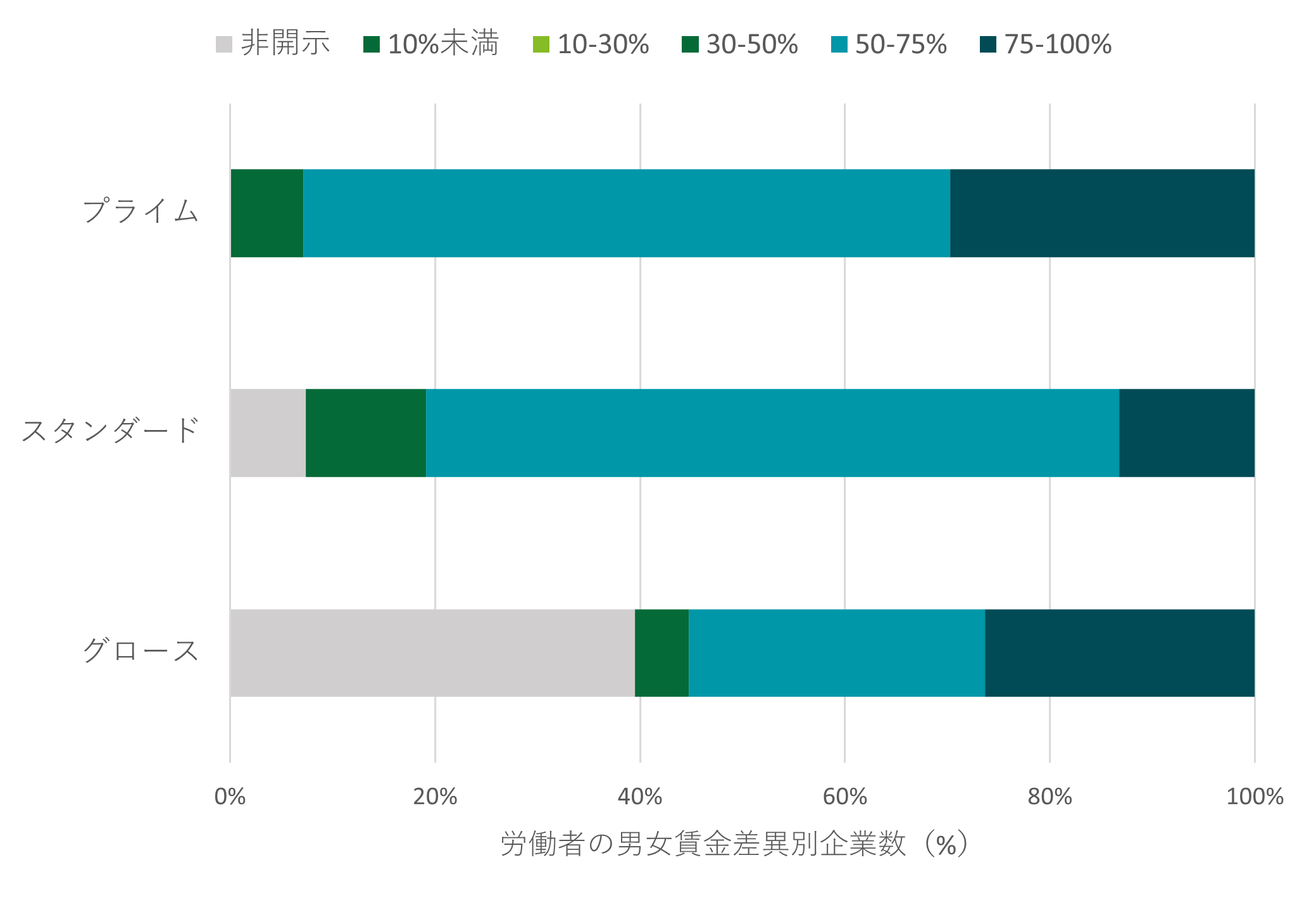 図3は企業内の非正規労働者を含む全労働者の男女賃金差異を上場市場別に集計し、企業数の割合を示したものです。男性従業員の賃金を100とした際の女性労働者の賃金を示しており、数値が高いほど賃金差異が小さいことを意味します。プライム上場企業でも約7割の女性の賃金が男性賃金の75%未満にとどまる結果となり、男女賃金差異がやや大きいことがわかりました。