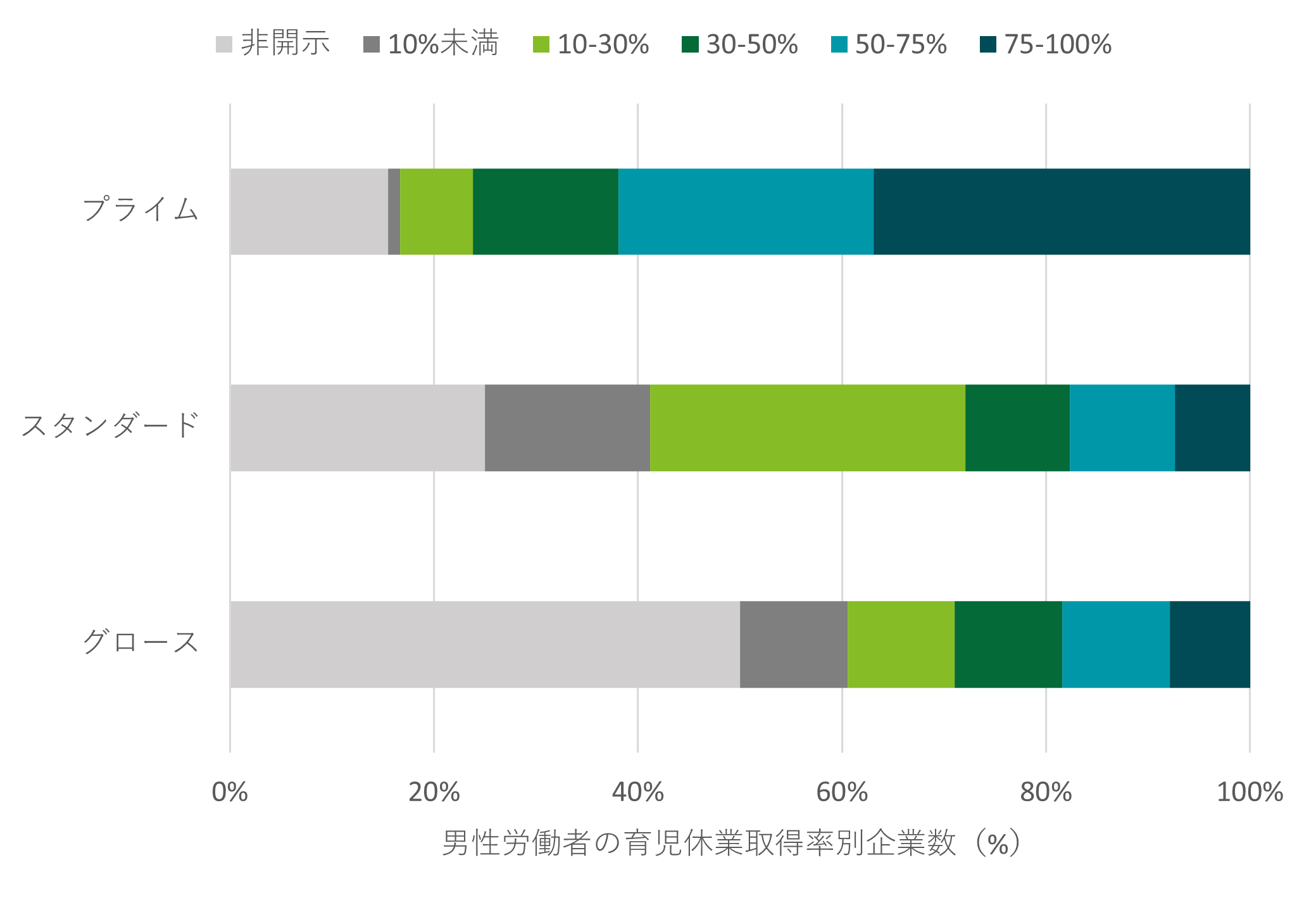 上場市場別に見ると、スタンダード、グロース上場企業と比べて、プライム上場企業においては社内の男性の育児休業取得率が30%以上の企業の割合が大きい結果となりました。