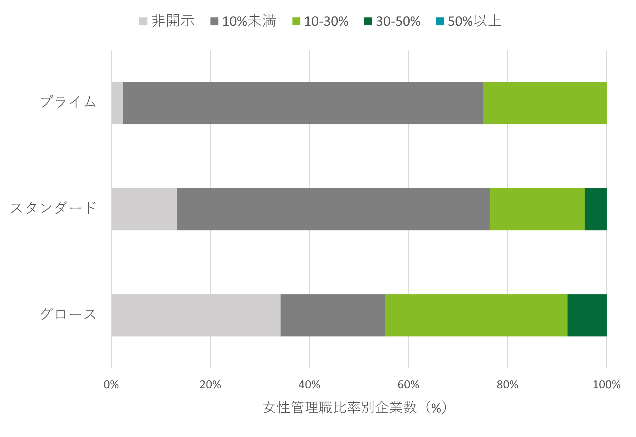 この要因としては、プライム上場企業と比較し、グロース上場企業の方が管理職の総数(母数)が少ないため、相対的に女性管理職比率が高くなっていると推察されます。